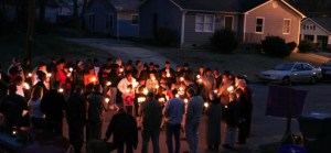 Movement three: Early Saturday morning we car-pooled to what police call the “Bulls Eye” of east Durham, a neighborhood of gifts yet also where most of our homicides happen (24 in 2009). In a church basement we sang “Spirit of the Living God, Fall Afresh on Me,” then heard stories from Marcia Owen—the director of the Religious Coalition for a Non-Violent Durham—and three friends who spent significant time in prison and are on pathways to deep transformation. I wll never forget the first pilgrimage to this basement, meeting a mother whose teenage daughter kept a precious photo album, full of obituaries of friends who had been killed.
